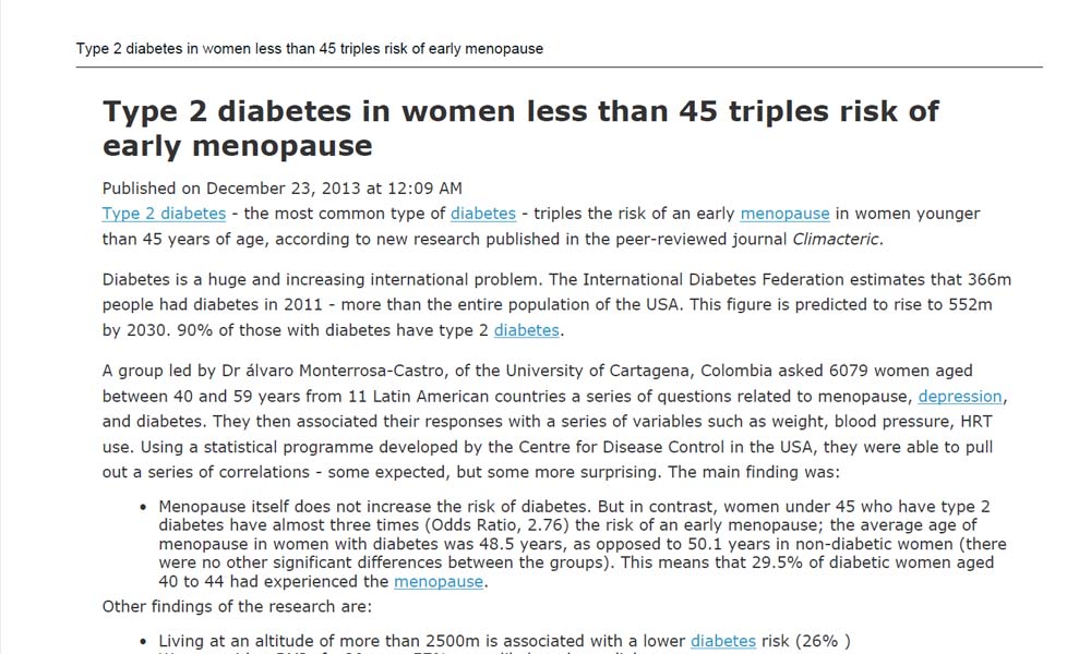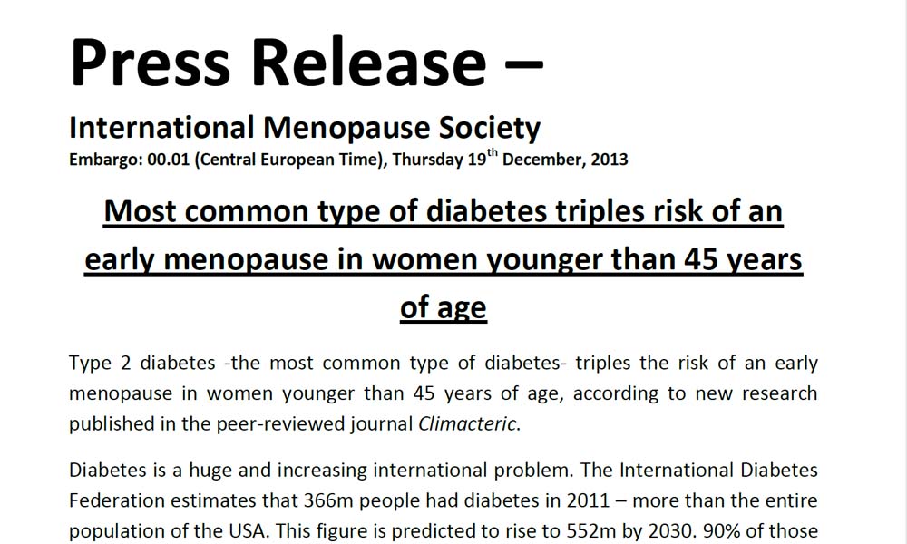 Most common type of diabetes triples risk of an early menopause in women younger than 45 years of age