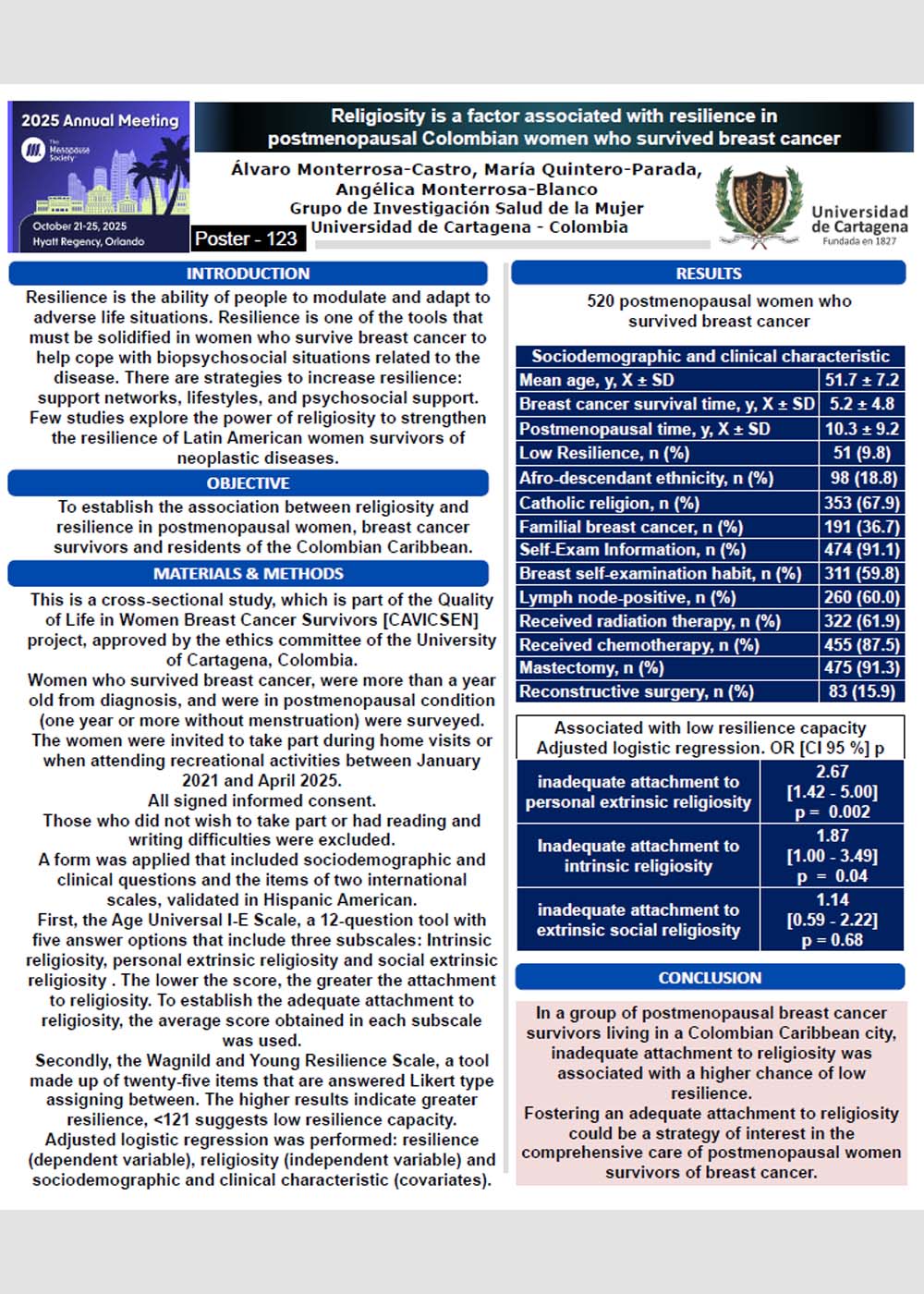 Religiosity is a factor associated with resilience in postmenopausal Colombian women who survived breast cancer
