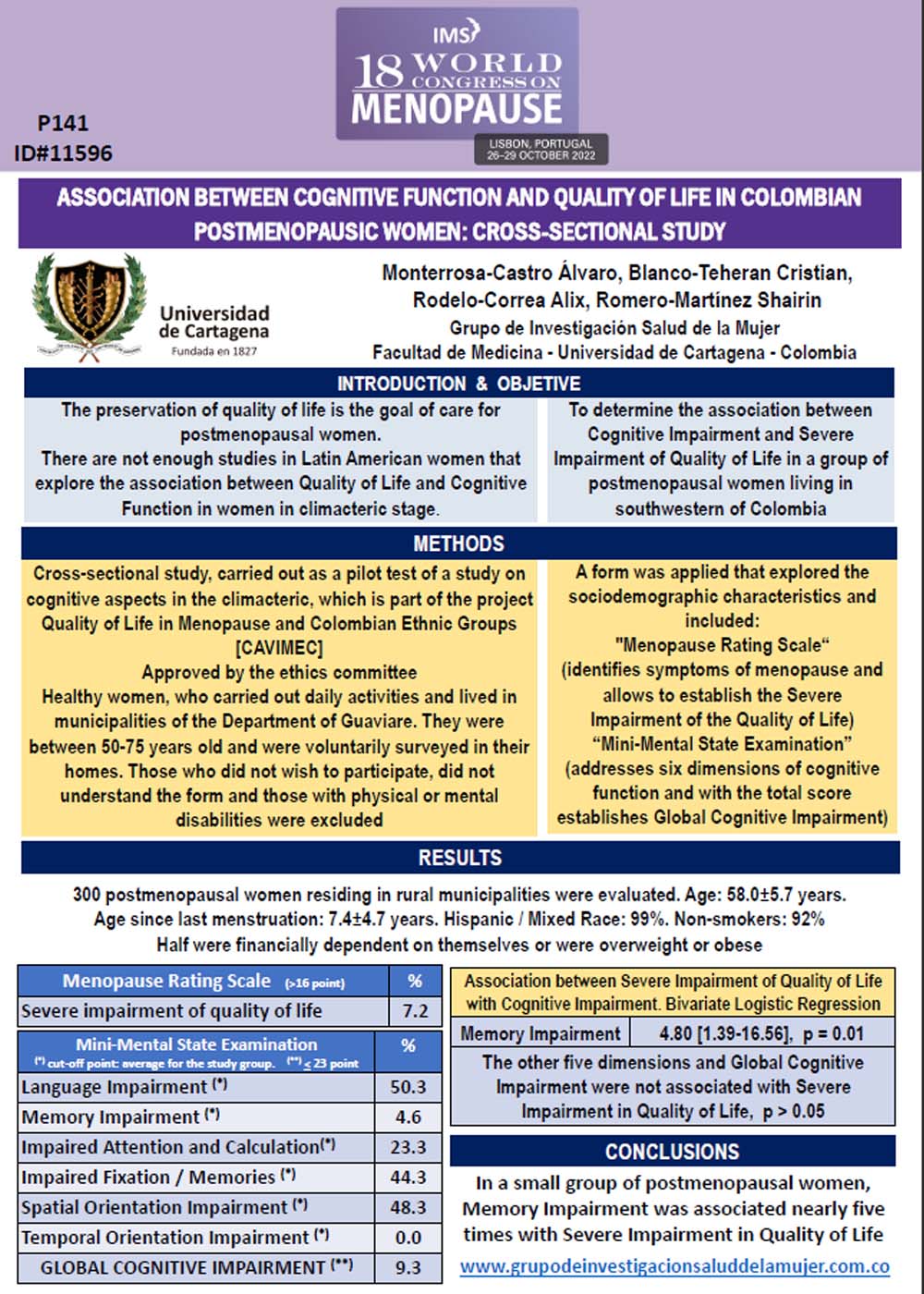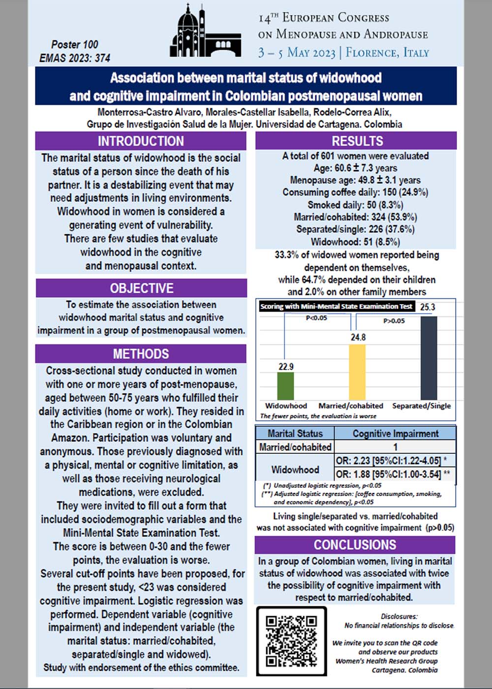 Association between marital status of widowhood and cognitive impairment in Colombian postmenopausal women