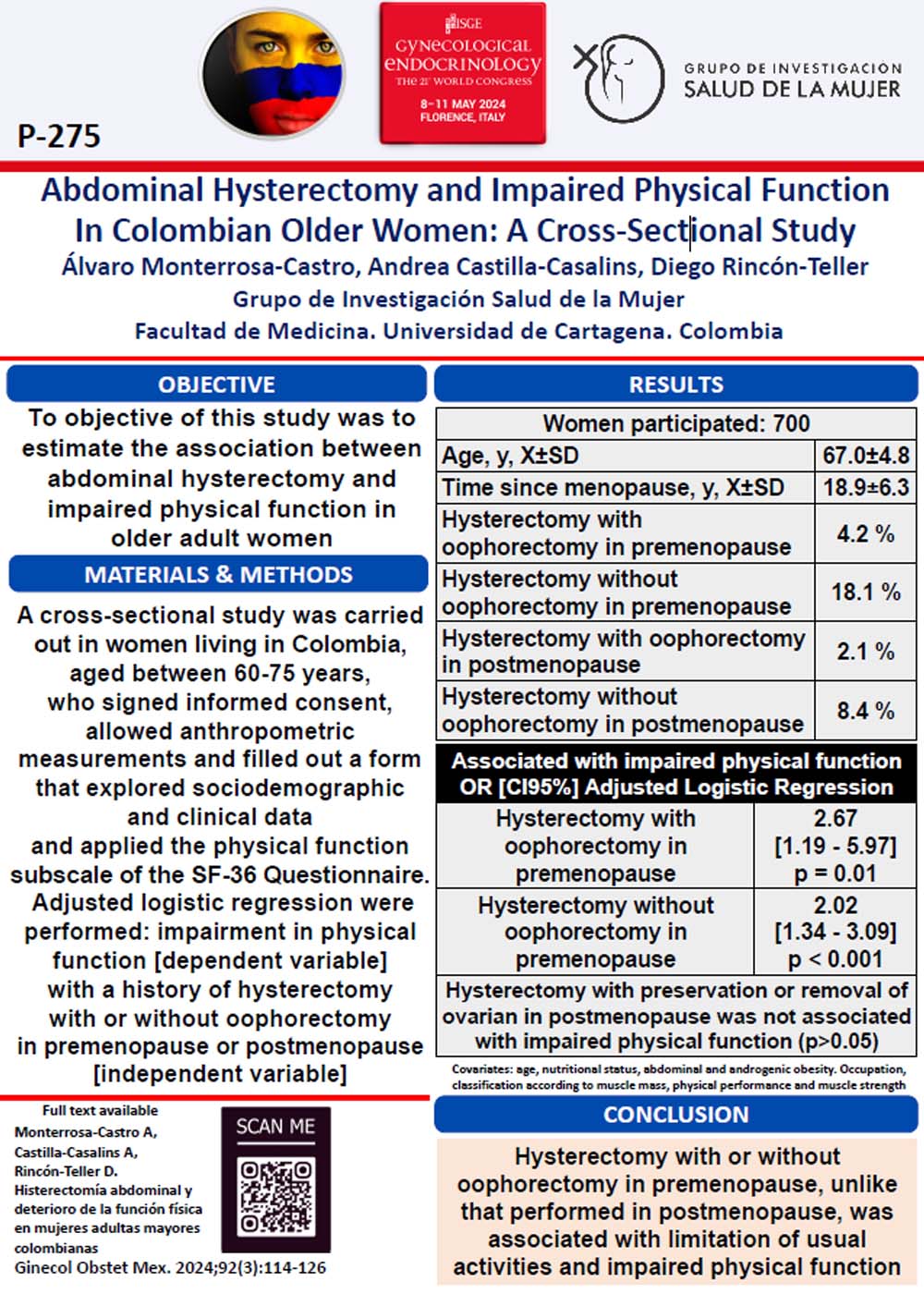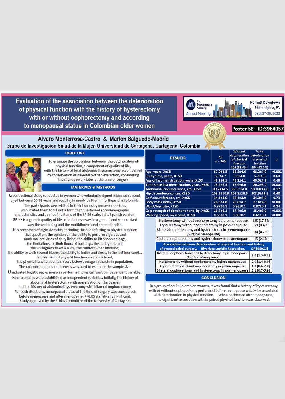 Evaluation of the association between the deterioration of physical function with the history of hysterectomy with or without oophorectomy and according to menopausal status in Colombian older women