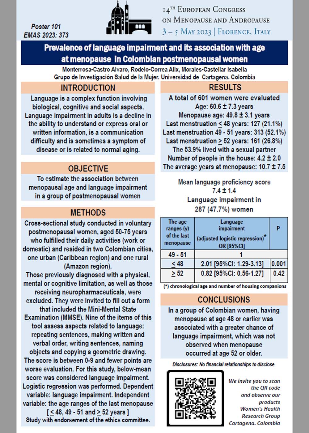 Prevalence of language impairment and its association with age at menopause in Colombian postmenopausal women