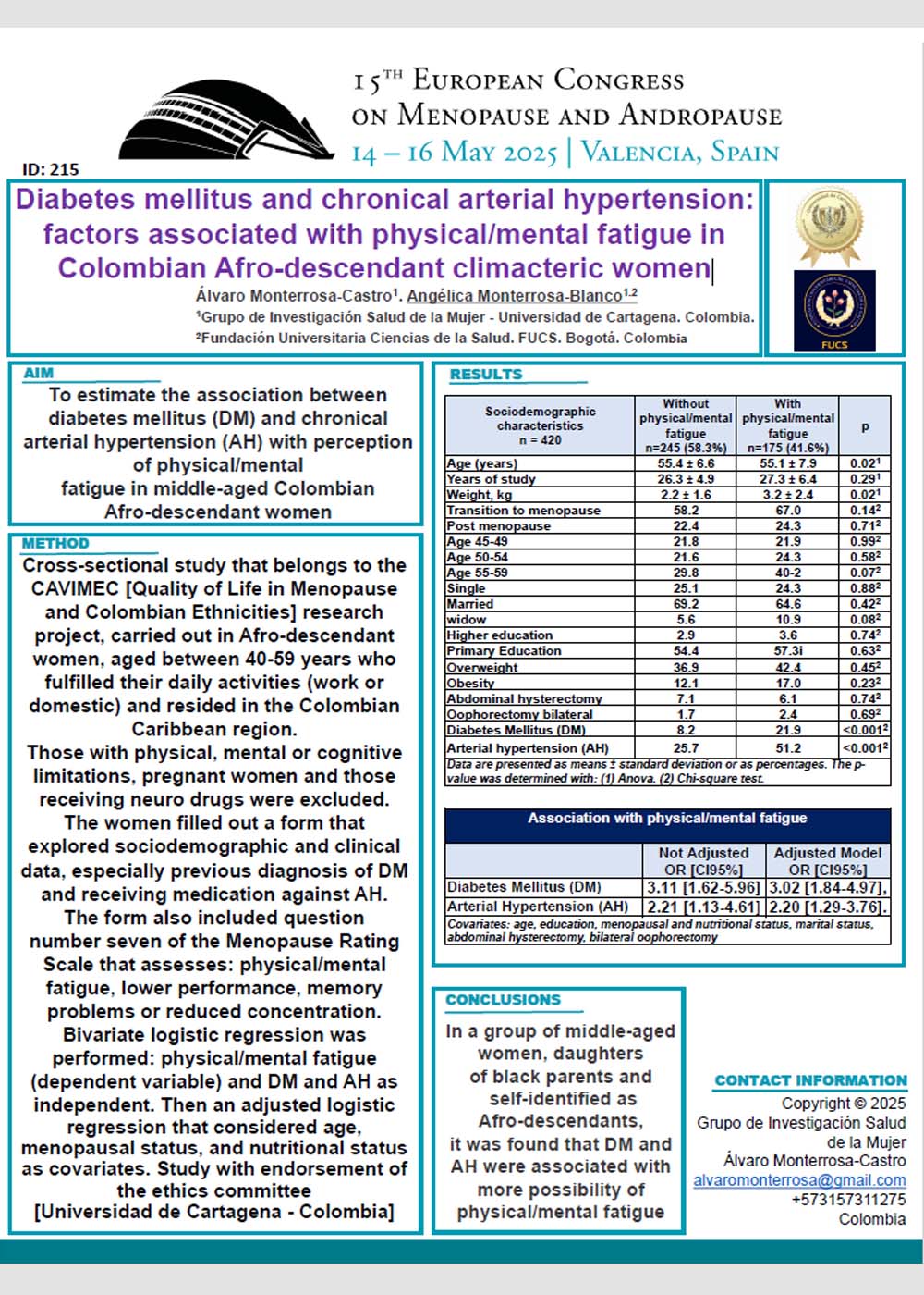 Diabetes mellitus and chronical arterial hypertension: factors associated with physical/mental fatigue in Colombian Afro-descendant climacteric women