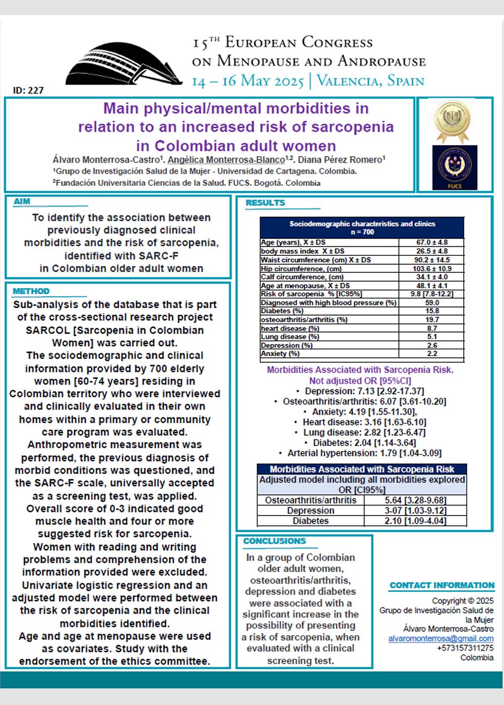 Main physical/mental morbidities in relation to an increased risk of sarcopenia in Colombian adult women